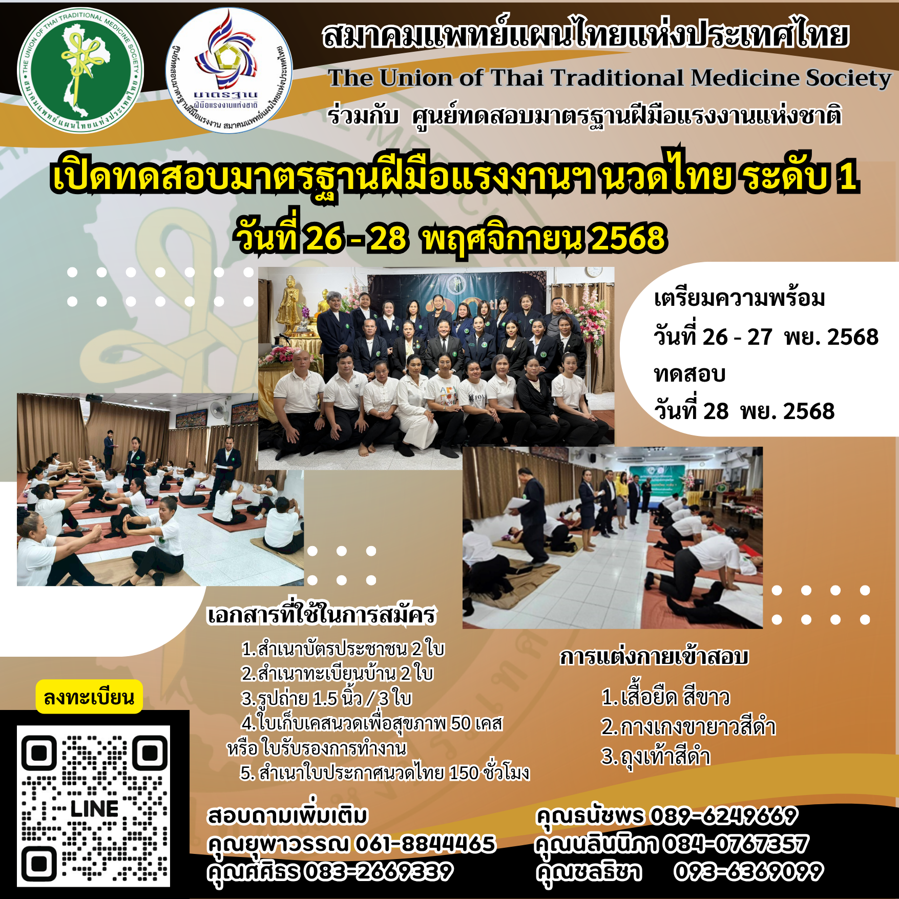ลงทะเบียนแล้ว เตรียมความพร้อม ปรับพื้นฐานการนวด และ ทดสอบมาตรฐานฝีมือแรงงาน ระดับ 1 วันที่ 26 - 28 พฤศจิกายน 2568 ณ สมาคมแพทย์แผนไทยแห่งประเทศไทย